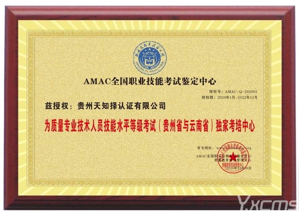 2019年12月30日,贵州天知择认证有限公司获得AMAC全国职业技能考试鉴定中心授权,成为贵州省和云南省质量专业技术人员技能水平等级考试独家考培中心。