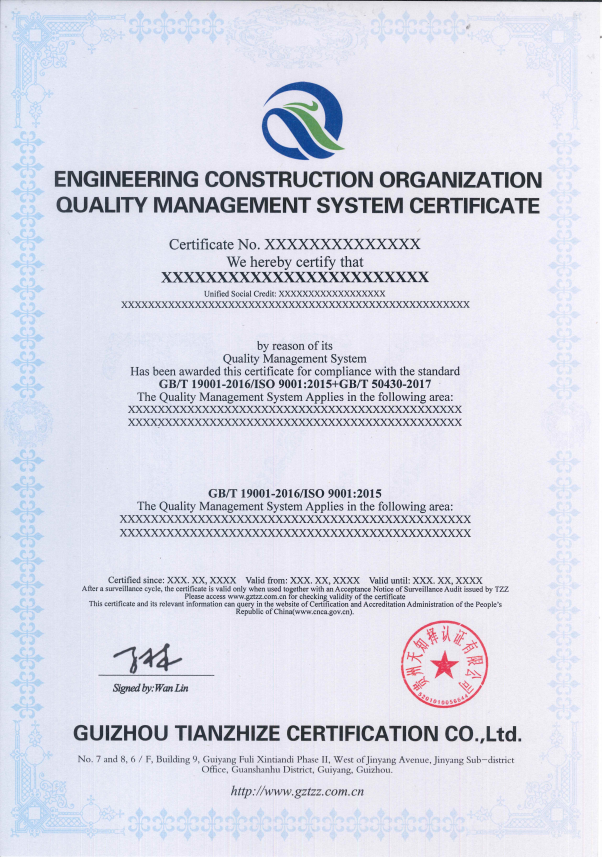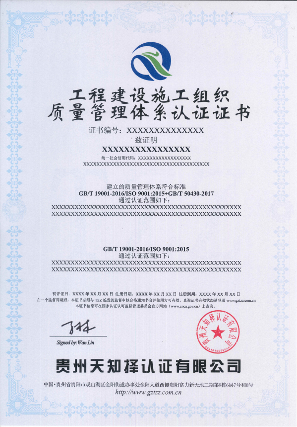EC 9000工程建设施工企业质量管理体系认证证书样本