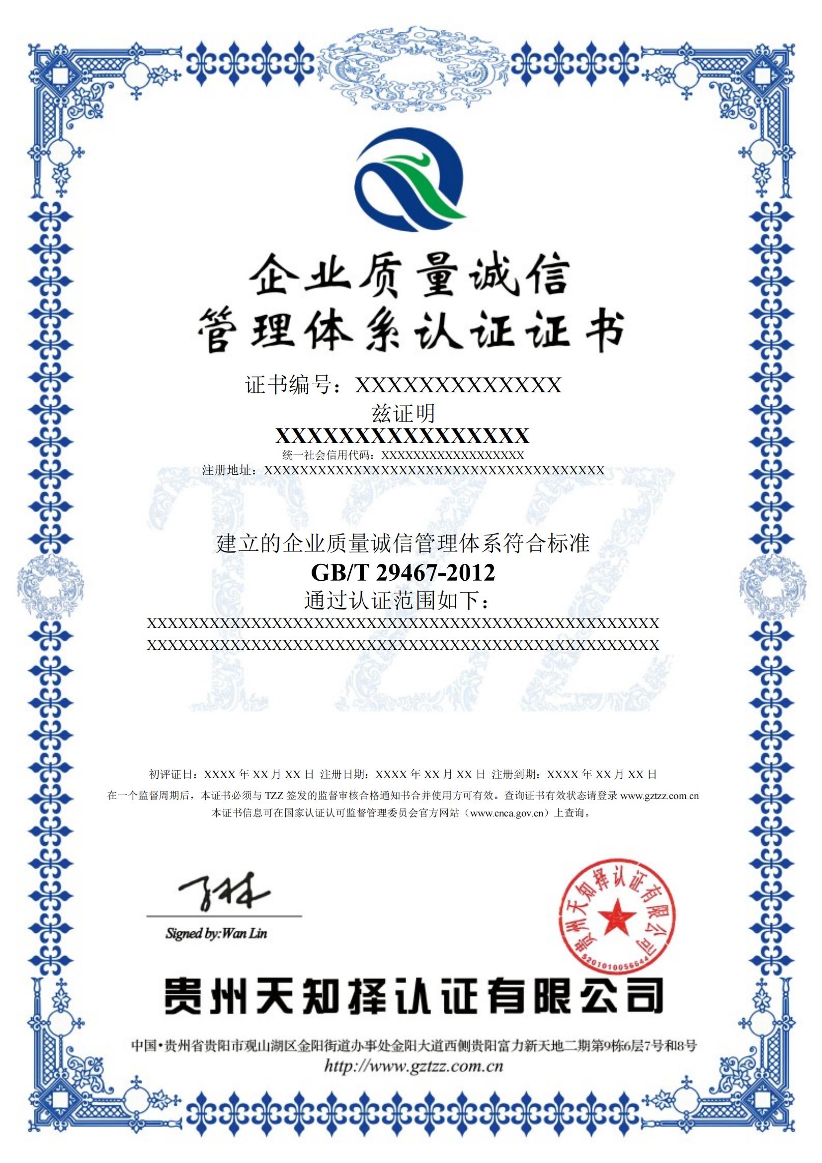 组织依据GB/T 29467-2012《企业质量诚信管理实施规范》认证标准建立、运行、完善管理体系,运行3个月以上,且进行了体系内部审核、管理评审,方能提出认证申请,且准备下面的资料:
